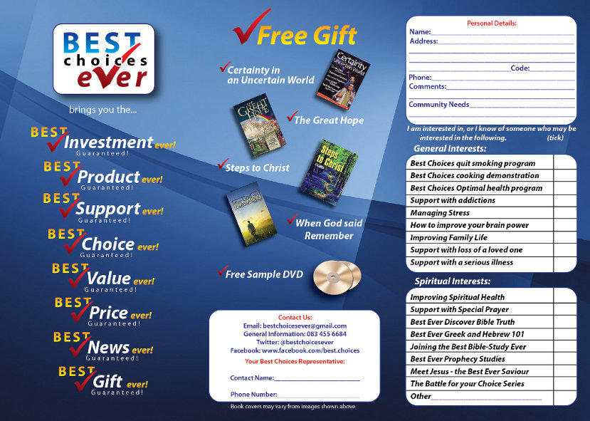 These are some of the resources available to help equip people for Personal Witnessing. This pamphlet can be used for personal ministries canvassing as well. Please feel free to enquire about any of these products at 083-455-6684